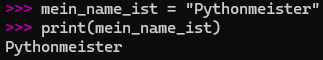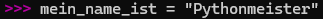 Achtung: Variablen auf Python können nicht Leerzeichen haben. Eine Variable als [mein name ist] ist nicht möglich und wird zu einem Syntax Fehler führen. [mein_name_ist] wird dir keine Probleme geben!