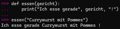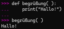 - Nach [def] kommt der Name der Funktion, hier [begrüßung]. Der Name ist willkürlich und könnte zum Beispiel [blahblah] sein.