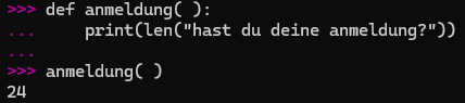 Aktivität: mach eine kurze Funktion namens “anmeldung”. Diese Funktion soll die Länge des Ausdruckes zahlen: “hast du deine anmeldung?”