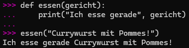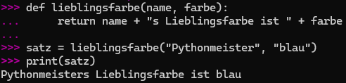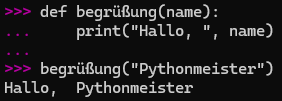 - “Pythonmeister” wird hier als das Argument dieser Funktion verstanden, weil “Pythonmeister” der [name] ist!