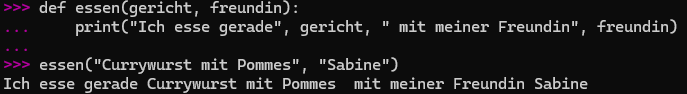 Die Parameter [gericht] und [freundin] sind einfach Platzhalter für die Argumente, “Currywurst mit Pommes” und “Sabine”.