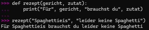 Aktivität: erstelle eine Funktion namens rezept( ), die zwei Parameter nimmt: [gericht] und [zutat]. Die Funktion soll ausgeben: “Für [gericht] brauchst du [zutat]”