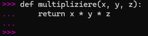 - [return] geht vor der Ausgabe, hier [x * y * z]
