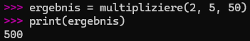 - In diesem Beispiel wurde die Funktion [multipliziere] in der Werte “ergebnis” gespeichert. Dann wurde die print( ) Funktion auf “ergebnis” verwendet.