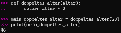 Schreibe eine Funktion names doppeltes_alter( ), die einen Parameter [alter] nimmt und den doppelten Wert mit [return] zurückgibt.
