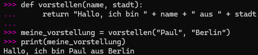 Erstelle eine Funktion names vorstellen( ), die zwei Parameter nimmt: [name] und [stadt]. Die Funktion soll eine Zeichenkette mit [return] zurückgeben wie: “Hallo, ich bin [name] aus [stadt].”