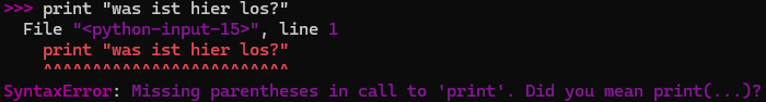 Das Rot dieses Syntax-Fehlers weist den Fehler hin und ist sehr hilfreich, wenn es viele Codezeile gibt. Obwohl dieser Syntax-Fehler auf Englisch ist, sehen wir unten rechts, dass bei der print( ) Funktion die Klammern fehlen!
