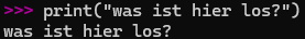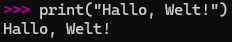 Der Text (in Anführungszeichen) geht in die Klammern der print( ) Funktion; die Ausgabe (was wir in die Klammern eingesetzt haben) kommt unten. Das ist normale Syntax auf Python! Syntax ist die Regel, wie du Code schreiben musst, damit Python ihn versteht.
